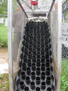 The key to the ELST is its unique ramp design that allows sea lamprey to pass, but not fin-fish. The ramp forms the entrance to the trap, and looks like a pegged slide enclosed in a cage. In contrast to traditional funnel traps, which are submerged in water, the ramp of the ELST protrudes partially out of the water on an angle, requiring fish to climb the ramp. A trickle of water from the top of the ramp wets the surface and entices fish to the ramp, but the water is not deep enough for fish to swim. Sea lamprey, which move using an eel-like (anguilliform) motion, use the pegs on the ramp to push upward, eventually slithering their way to the top and finally falling into a collection cage a few feet below the top of the ramp (Figures 3 and 4). Fin-fish, on the other hand, cannot propel themselves around the numerous, closely spaced pegs on the ramp, and are thereby blocked from climbing.