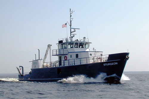 The R/V Sturgeon, based in Cheboygan, Michigan, was built in 1974 and currently operates on Lake Michigan and Lake Huron. The Sturgeon was transferred to the USGS Great Lakes Science Center in the 1990s and was later retrofitted and commissioned in 2004. The Sturgeon supports fisheries related science, including deepwater studies, restoration ecology, and invasive species assessment, to aid in management decisions for top predator fish. The name, "Sturgeon", derives from one of the most ancient native fish in the Great Lakes, the Lake Sturgeon. The Sturgeon can be at sea fifteen days with sleeping accommodations for ten people.