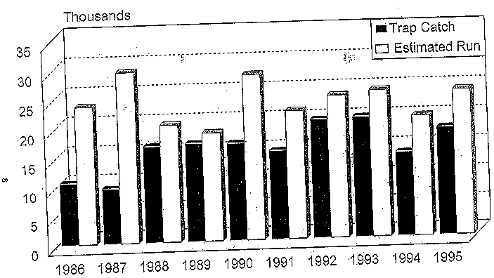 The Service annually has operated an assessment network for spawning-phase sea lampreys on 11-13 streams in Lake Michigan, and we present this information as total catch in all other rivers and estimated spawning population in the Manistique River, 1986-95 (Fig. 3). This index shows the population in the lake has been relatively stable during the time period, but our assessments also show lampreys are more abundant in the northern part of the lake than in the south.