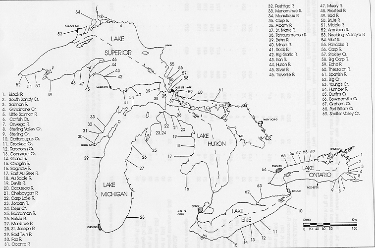 Table 18.  Mean discharge for streams north and south of Alpena, Michigan-Espanola, Ontario in Lake Huron, ranked as primary and secondary producers of sea lampreys and the estimated number of spawning-phase sea lampreys in 1995.