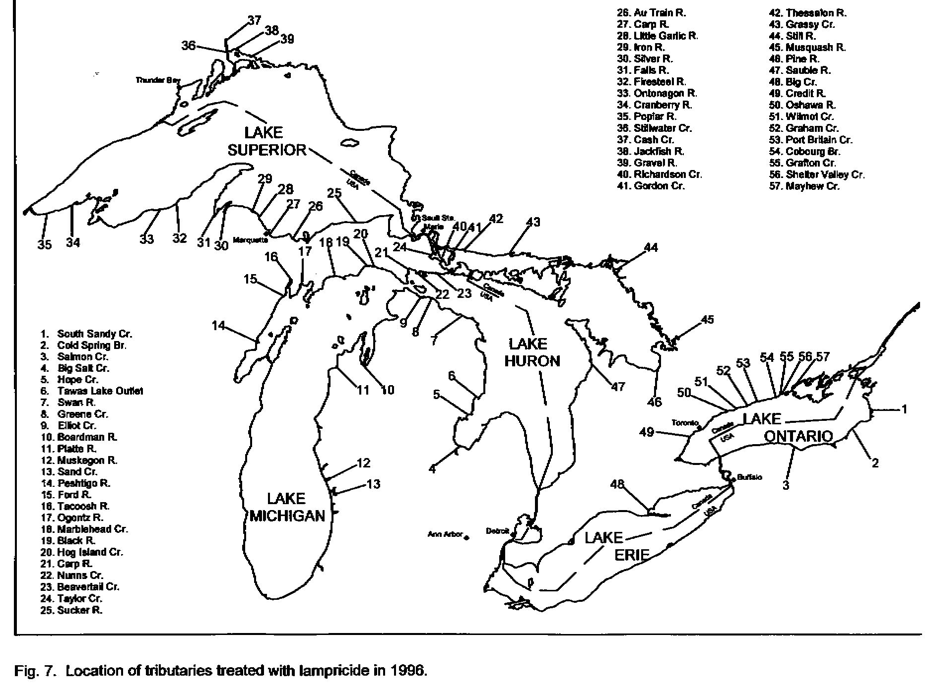 - 13 (4 United States, 9 Canada) tributaries have been treated with lampricide