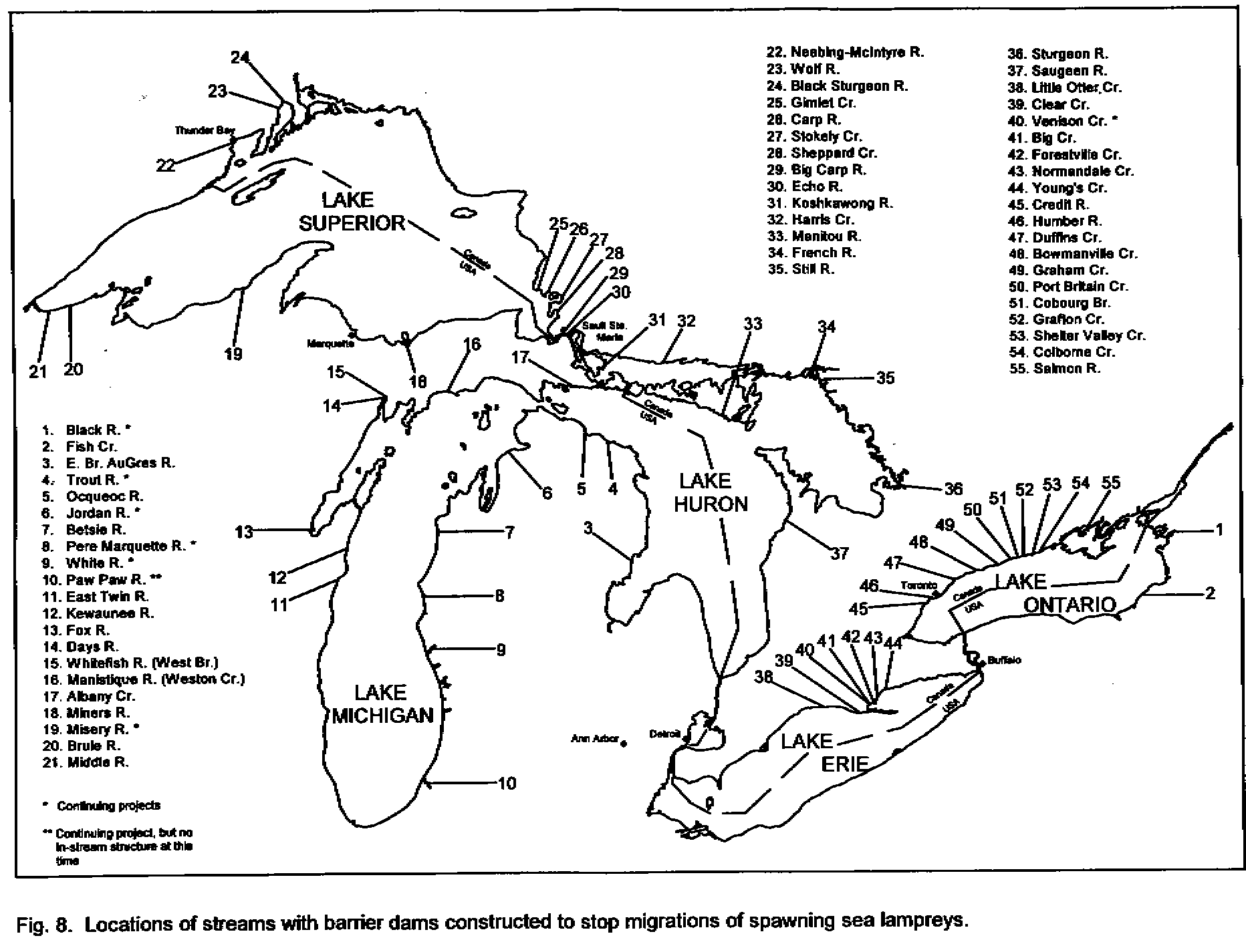 barrier dams constructed or modified to stop spawning sea lamprey migrations.