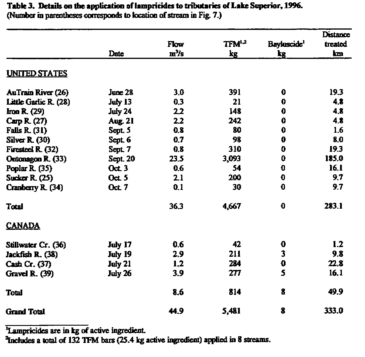 Table 3 provides details on the applications of lampricides to 15 tributaries
