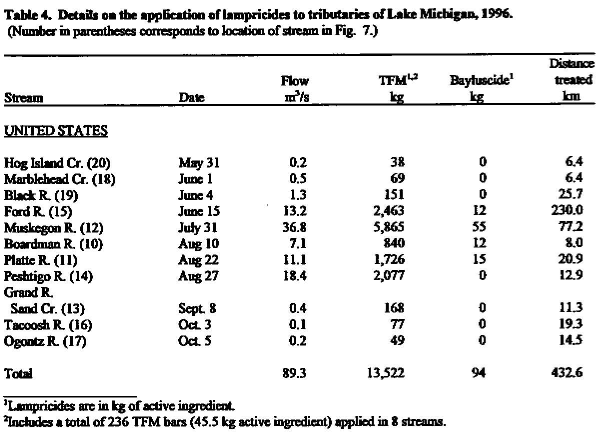 Table 4 provides details of the application of lampricides to 11 tributaries