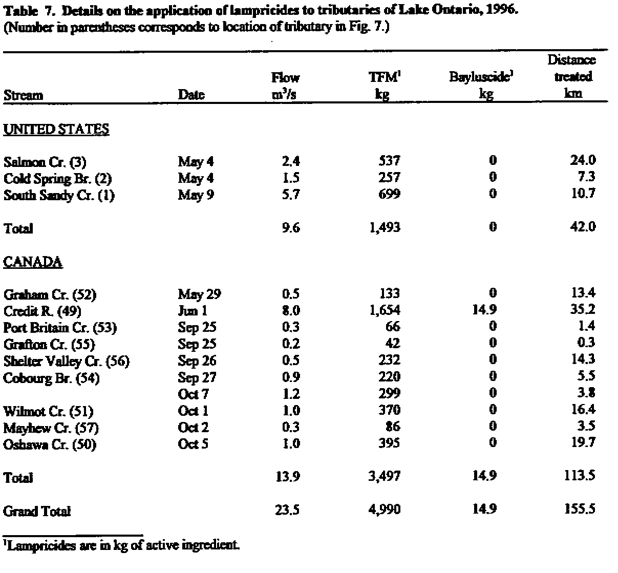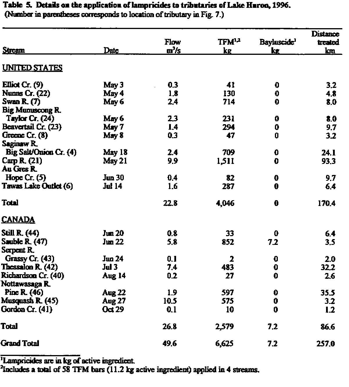 Table 5 provides details of the application of lampricides to 18 tributaries